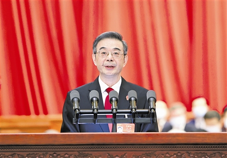 受全国人大常委会委托,栗战书委员长向大会报告全国人大常委会工作。栗战书在报告中指出,在以习近平同志为核心的党中央坚强领导下,全国人大常委会坚持以习近平新时代中国特色社会主义思想为指导,深入贯彻习近平法治思想,履职尽责、积极作为,为推动重大工作部署、应对重大风险挑战、维护国家安全提供法律保障,有效发挥了国家权力机关的职能作用。