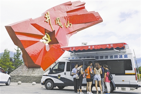 在井冈山黄洋界景区,记者看到景区门口的显要位置设立了井冈山生态旅游法庭的标识和标牌,并公布了诉讼服务热线。景区门口还停有一辆巡回审判车,车内配有国徽、法台、当事人座椅,并配备电脑、打印机,能随时制作裁判文书。“这辆车就是我们的一个移动‘微法庭’。”井冈山法院生态旅游法庭庭长张恒飞笑着跟记者说道。