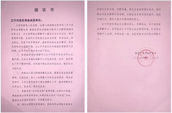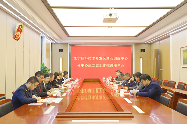 2021年4月28日,为认真落实最高人民法院、全国工商联《关于发挥商会调解优势 推进民营经济领域纠纷多元化解机制的意见》,江苏省高级人民法院民二庭《关于做好商会商事调解工作的通知》等相关文件精神,在江宁经济技术开发区商会调解中心成立一周年之际,江宁经济技术开发区商会调解中心的两家分中心——江宁开发区商会分中心和禄口街道商会分中心正式挂牌成立。