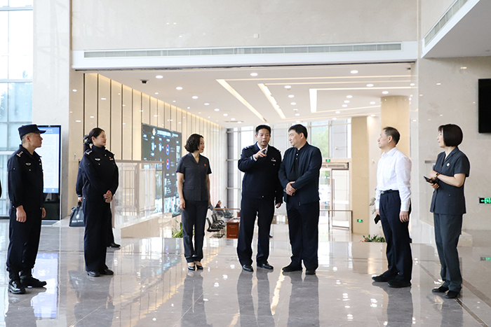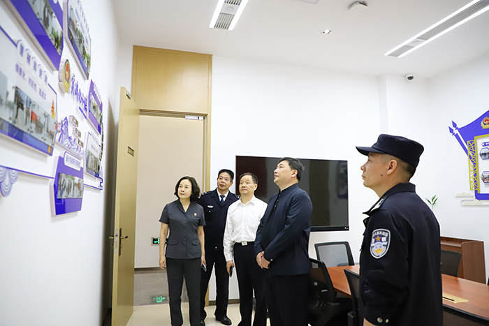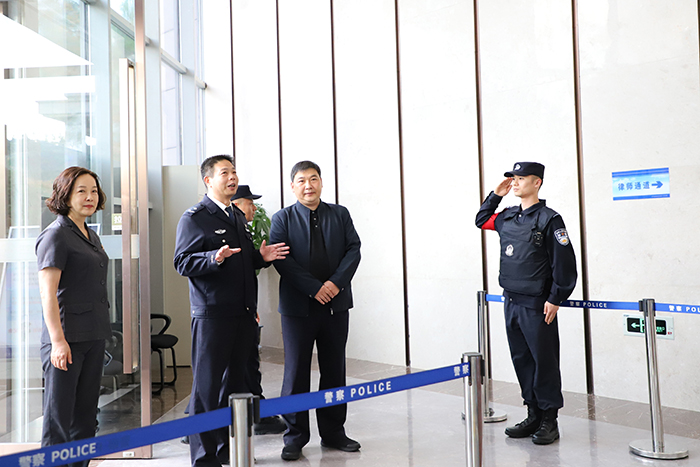 刘斌一行现场查看了江宁开发区法院安检大厅、审判法庭、诉服大厅、警用装备室等场所,询问了各项警务保障工作开展情况,听取了法警大队扎实做好安全风险管控措施的汇报。随后对基层一线警队在预防、发现和处置警务安全风险和突发事件中的问题困难和工作经验展开了调研、座谈。